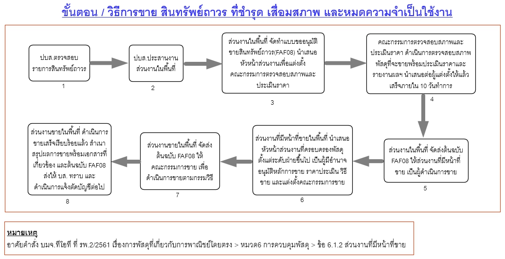 ตามบันทึกเลขที่ ปบส./327 ลงวันที่ 10 สิงหาคม 2563 การดำเนินการเกี่ยวกับสินทรัพย์ถาวรที่ชำรุดและหมดความจำเป็นใช้งาน ซึ่ง บส. และ พค.ได้ประชุมหารือ เมื่อวันที่ 29 กรกฏาคม 2563 โดยสรุปเป็น ขั้นตอน และวิธีการขายฯ ดังรูปด้านล่าง และดาวน์โหลด รายละเอียดสินทรัพย์ถาวรที่ชำรุดฯ ด้านล่างนี้